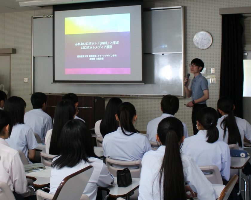 令和7年9月19日(金)に1年生の「産業社会と人間」において愛知産業大学との高大連携授業を実施しました。 造形学部 スマートデザイン学科 准教授 大島直樹 氏をお招きし、AIメディアロボット