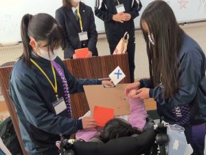 お知らせ/学校行事 第2回岡崎特別支援学校との交流会 2026年1月13日 12月12日(金)に岡崎特別支援学校との交流会が本校にて行われました。クリスマスツリーをスタンプで飾りつけすることと、〇×クイズを用いたビンゴの2つのレクリエーションを実施しました。色やスタンプ、クイズの答えを相談しながら楽しく行うことができました。最後には、お互いが作ったクリスマスカードを交換しとても良い交流ができました。